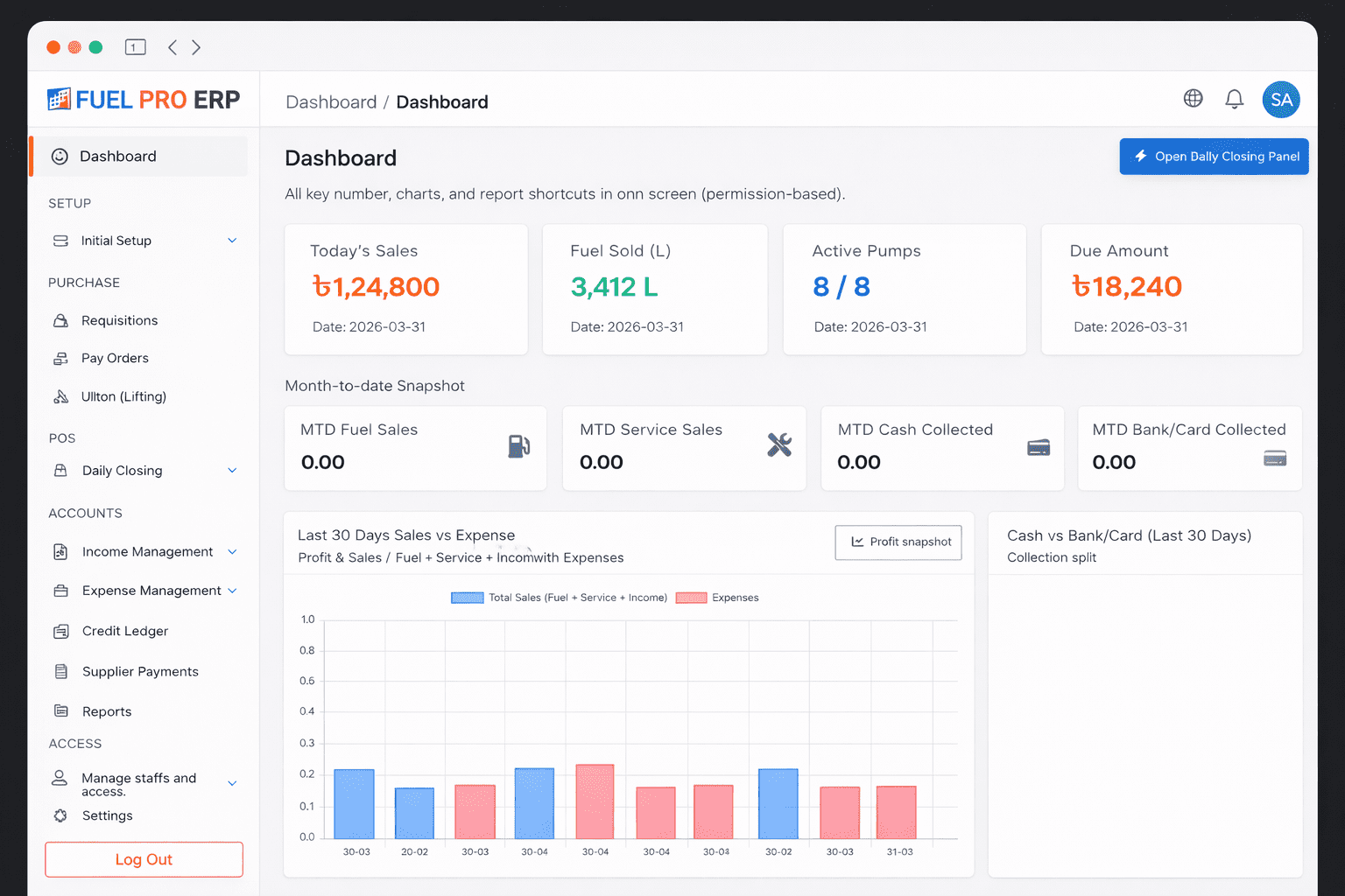 Record opening and closing meter readings for every nozzle across all pumps. Automatically calculate fuel dispensed, revenue earned, and shortages — shift by shift.